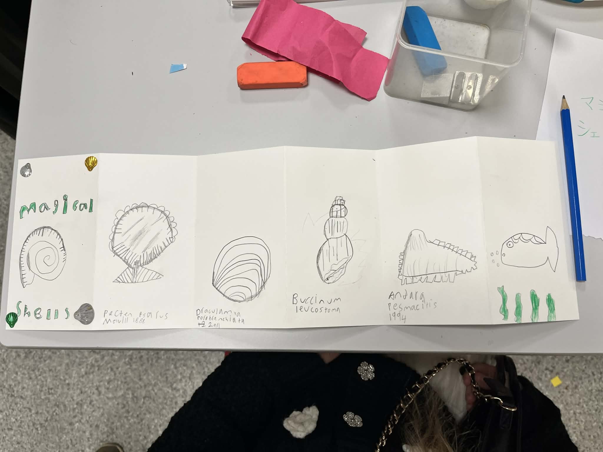His ‘Kai-Chigusa’, inspired me of making folded booklets in the workshop. Every one of the participants, I hope, enjoyed to make its own unique booklet about marine biology.
