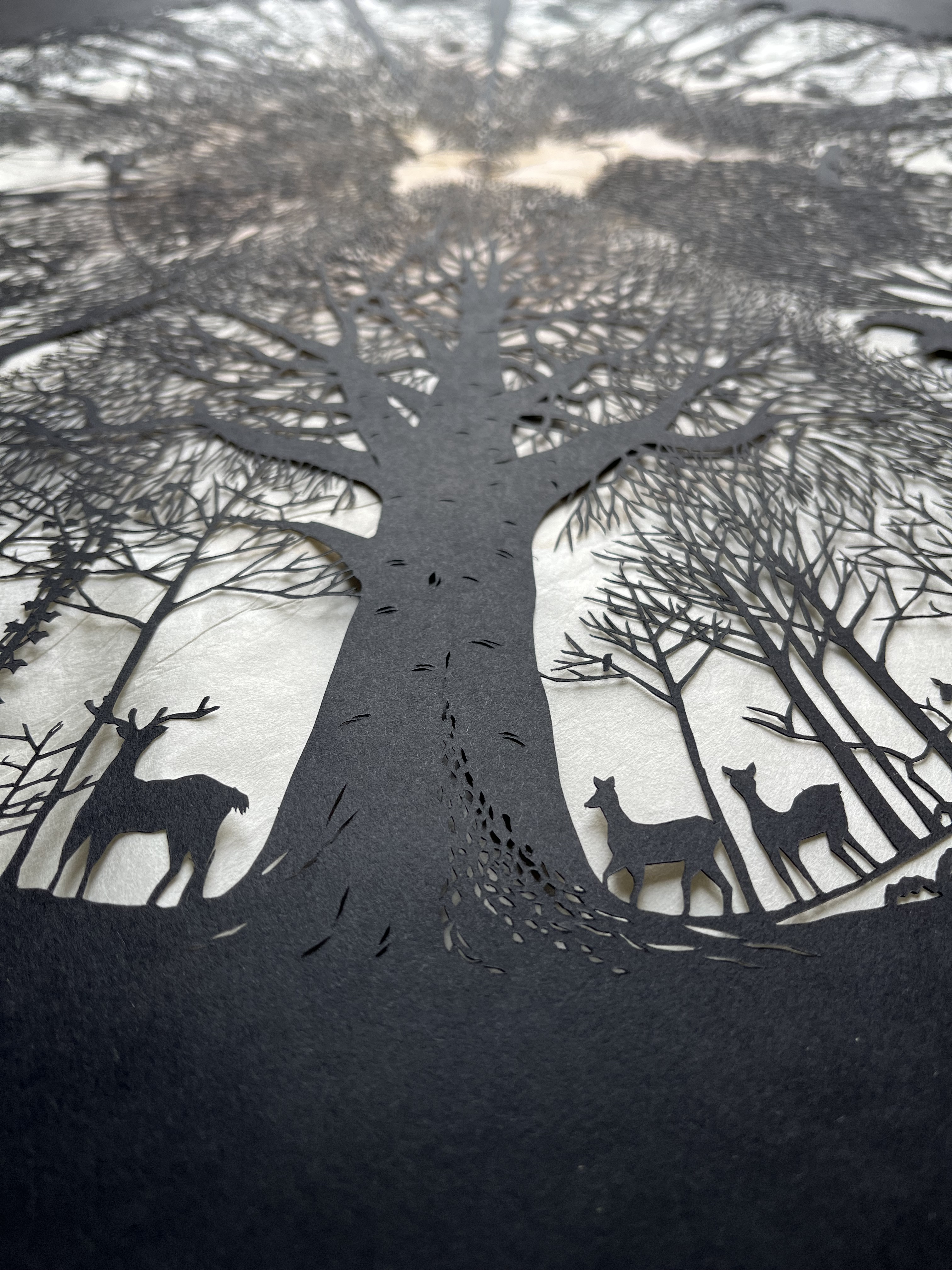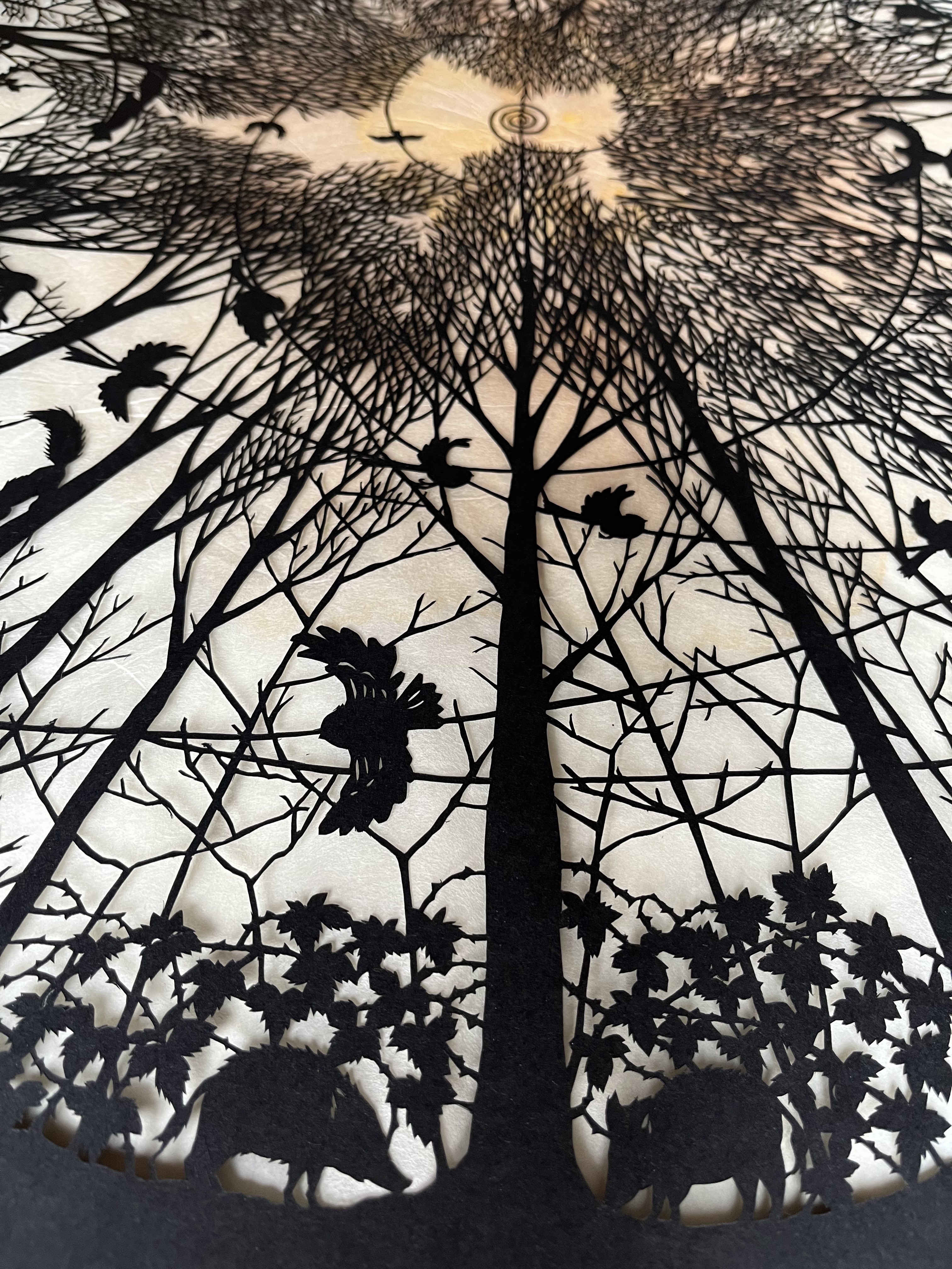 Card paper (made in the UK) for papercut, Japanese washi-paper for the background, coloured with extract from fallen beech leaves & water colour