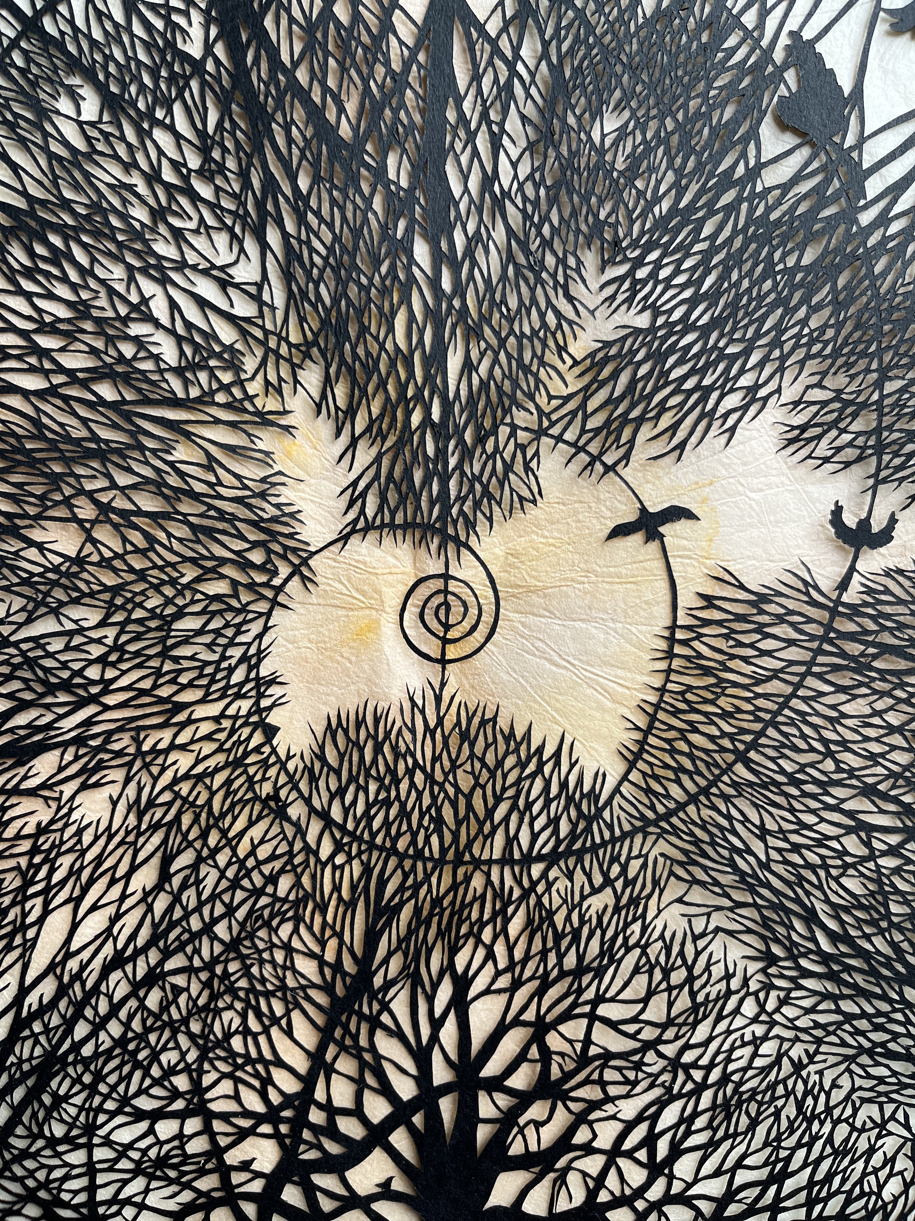 I created a large paper-cutting piece and an experimental installation piece which links to the paper cut piece. The materials are all natural, sustainable, and biodegradable, no plastic or metal. Paper that I used is various types of Japanese washi paper. The basic structure is made with vines, branches, grass leaves from my garden.