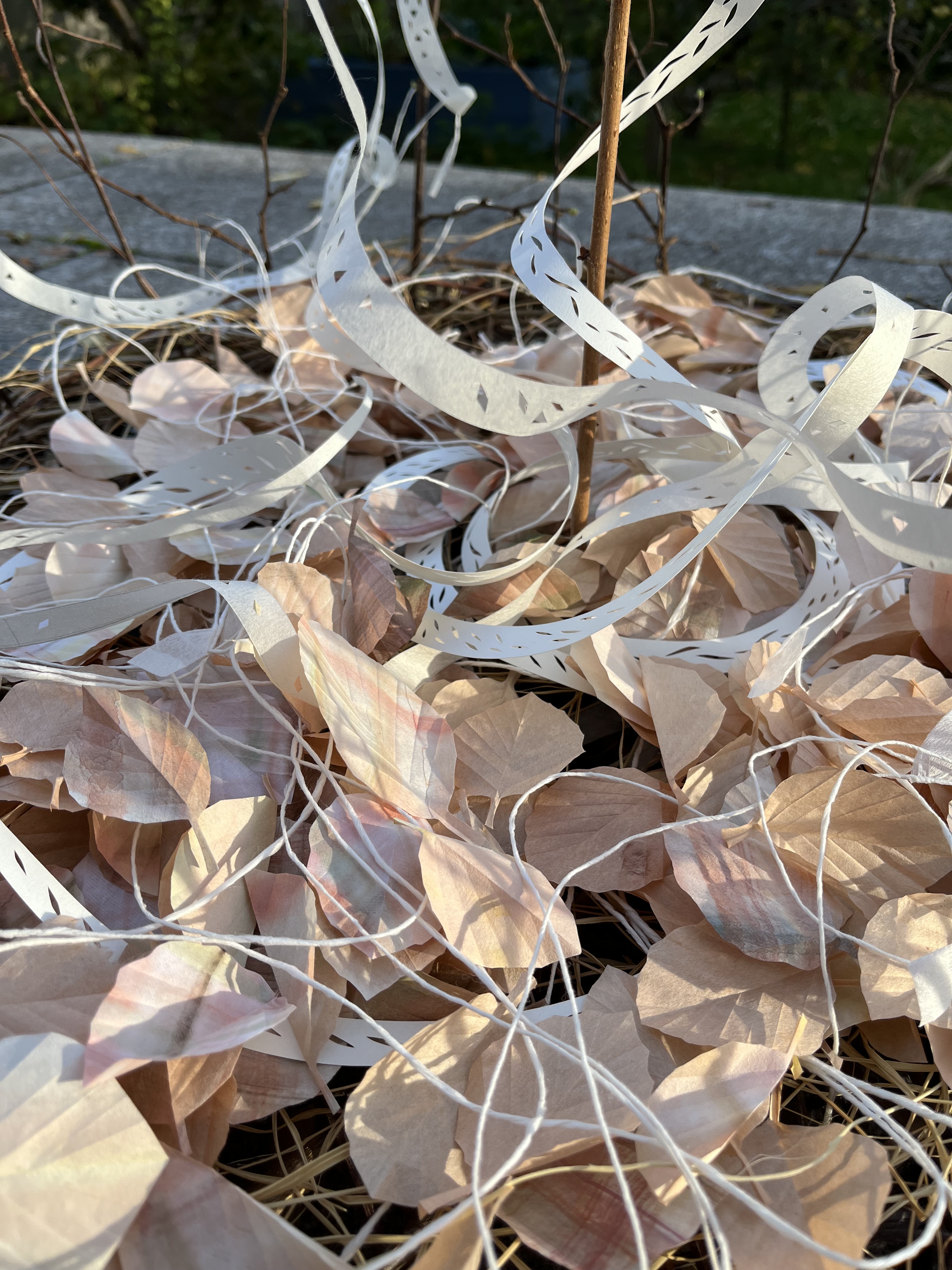 Ko-yori(紙縒り): twisted paper. The twisted paper pieces are traditionally used for hanging paper pieces on which wishes and prays are written. No glue used. For my 3D artwork, I used them to hang paper leaves as praying for future.