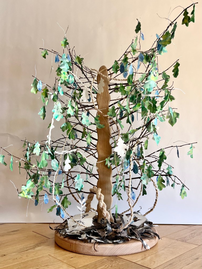 Materials: various types of paper (Japanese washi paper, manila paper, and other recycled paper), solid oak, pruned branches, grass (ropes) watercolour and calligraphy ink