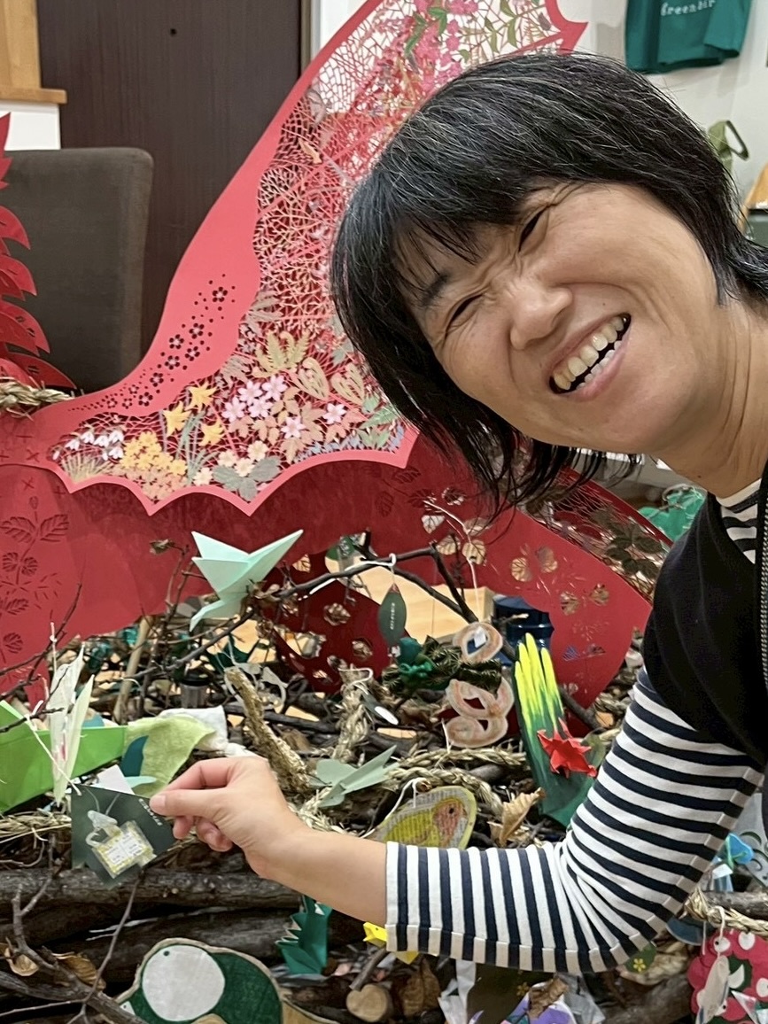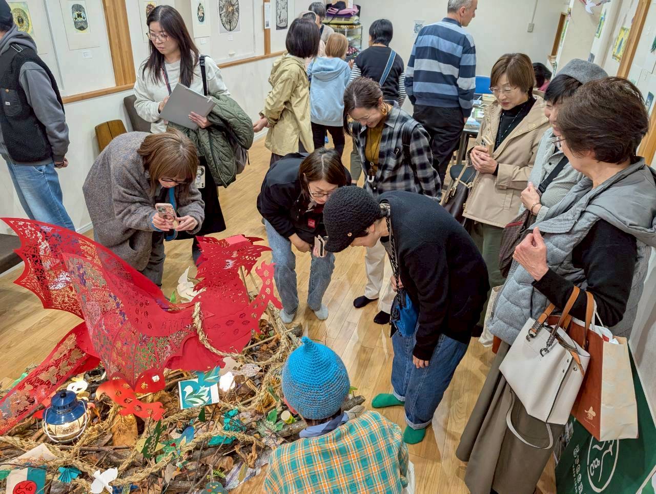 On installation day, with the cooperation of Karikari-chan, the venue manager, Take-chan and Nakano-kun from the Himeji team, and Masa-san, the owner of Innuit, we completed a collaborative piece. Numerous environmentally conscious artworks and my own paper cuttings, which have come to focus on environmental issues, were also exhibited at the venue. In total, nearly 150 pieces were submitted.